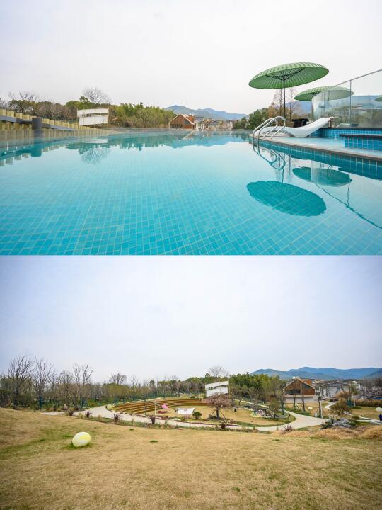 酒店去年才开业,是一家温泉度假酒店。有室外泡池,我们住得圆庭私汤房的阳台上还有个泡池。因为没带泳衣就在房间里泡,和女儿下午坐着泡脚,泡得热热的,很舒服。