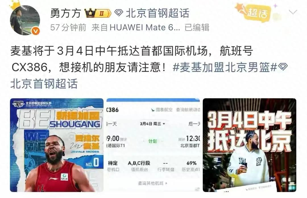 据媒体人爆料,北京首钢刚刚签下的我NBA超级中锋将会在3月4日抵达北京和球队汇合,球迷心心念念的大麦基就要来了!北京签下麦基之后,将会是北京队本赛季争冠的最后一块拼图,许利民现在估计是乐开花了,接下来可以全力冲击冠军了!