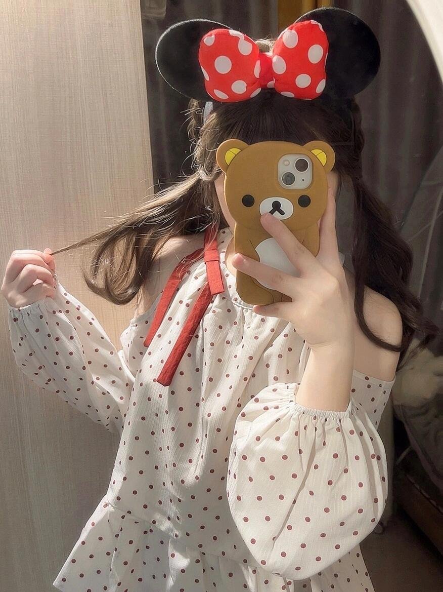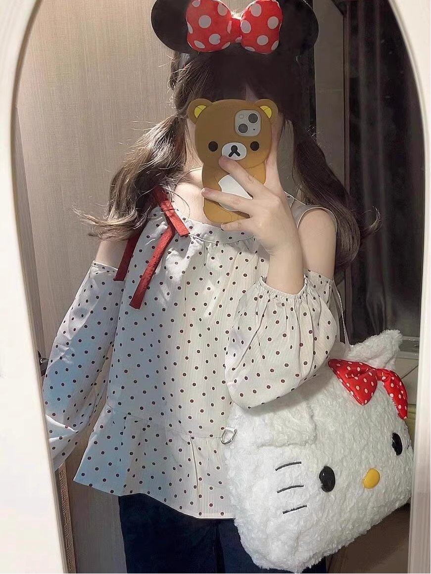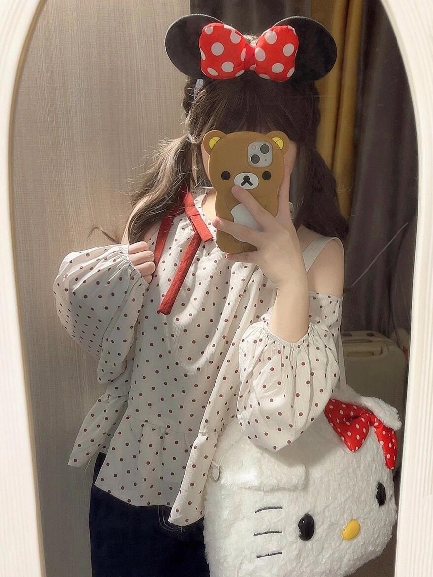 可爱少女红色蝴蝶结波点露肩衬衫!好好看
