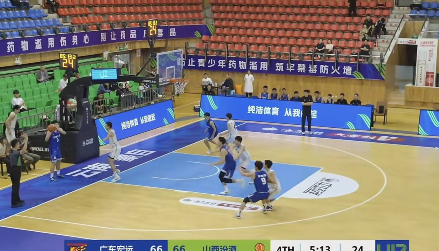 最后5分13秒。广东全场紧逼防守,山西失误,徐小华突施冷箭投进三分。广东69比66山西汾酒男篮。