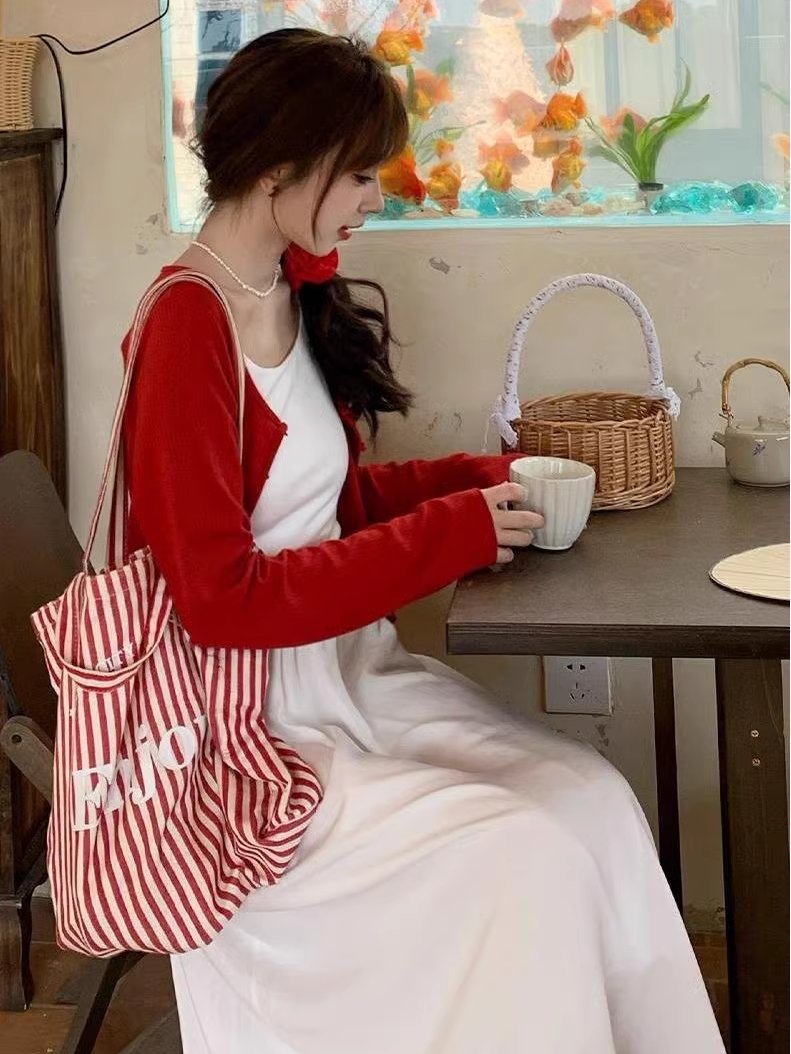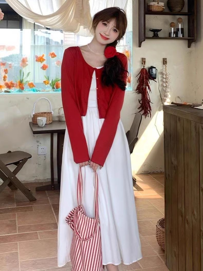 春季流行气质穿搭白色吊带连衣裙子2025新款收腰长裙一整套装女夏