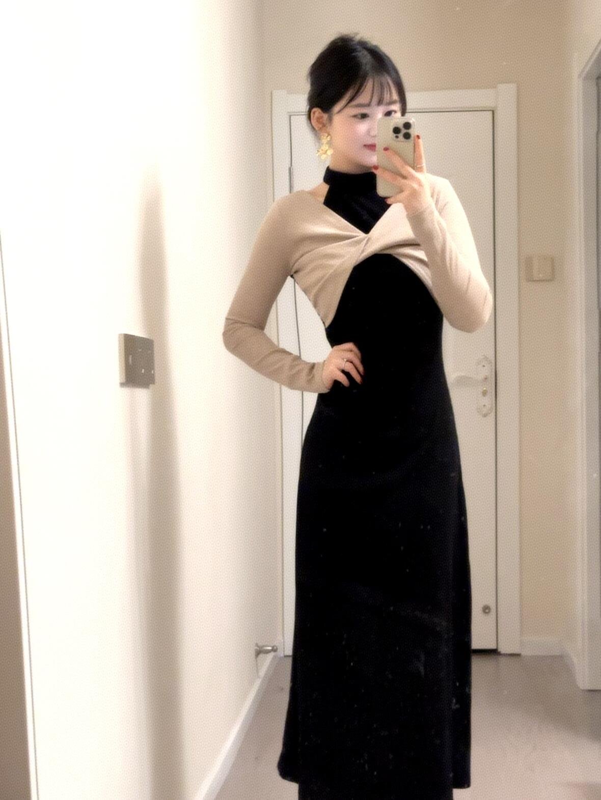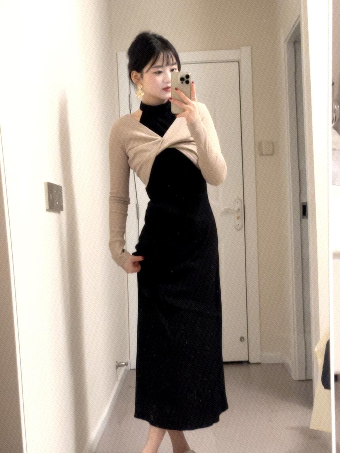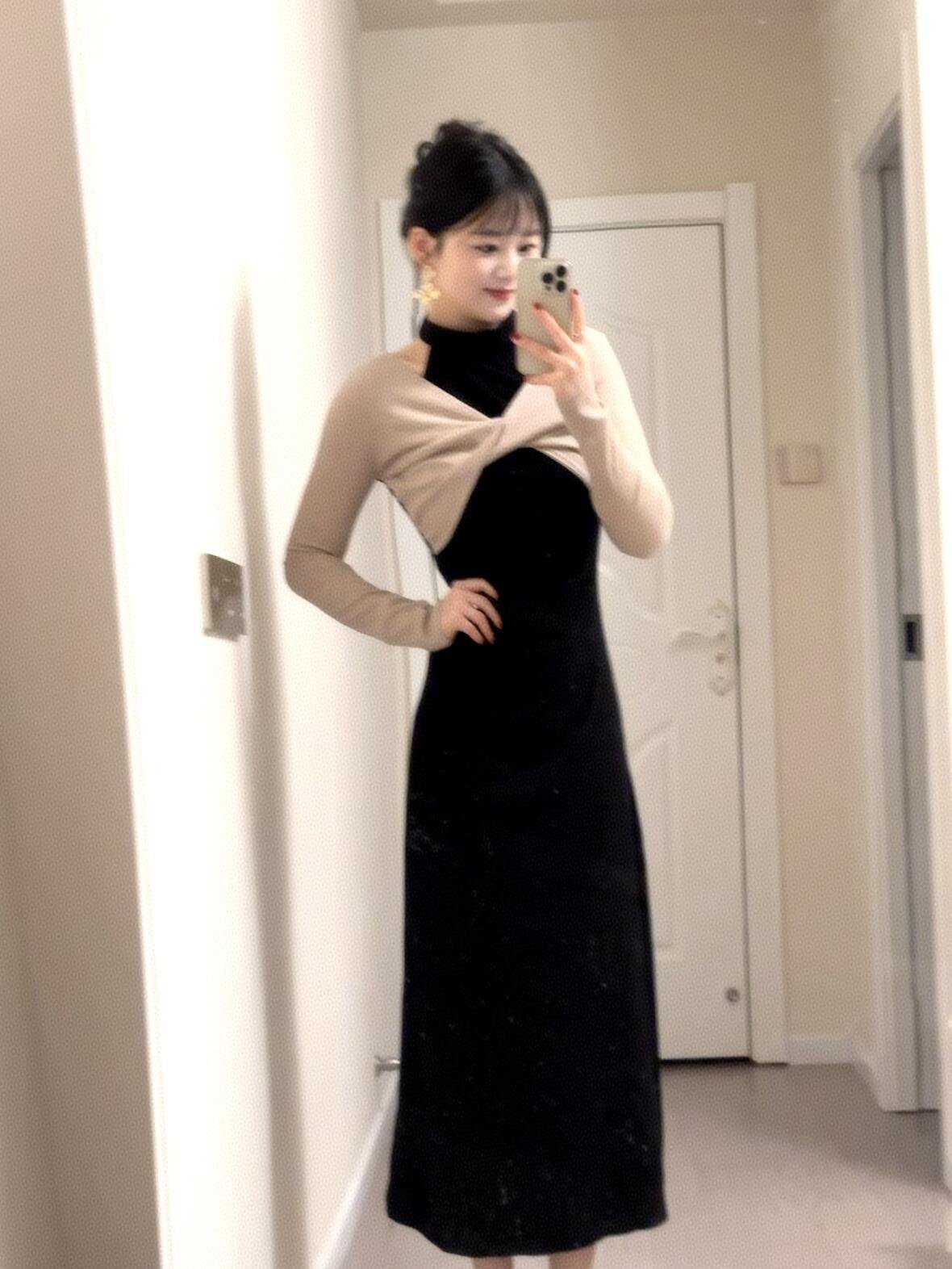 法式黑色假两件挂脖针织连衣裙子开春气质穿搭2025新款露肩长裙夏