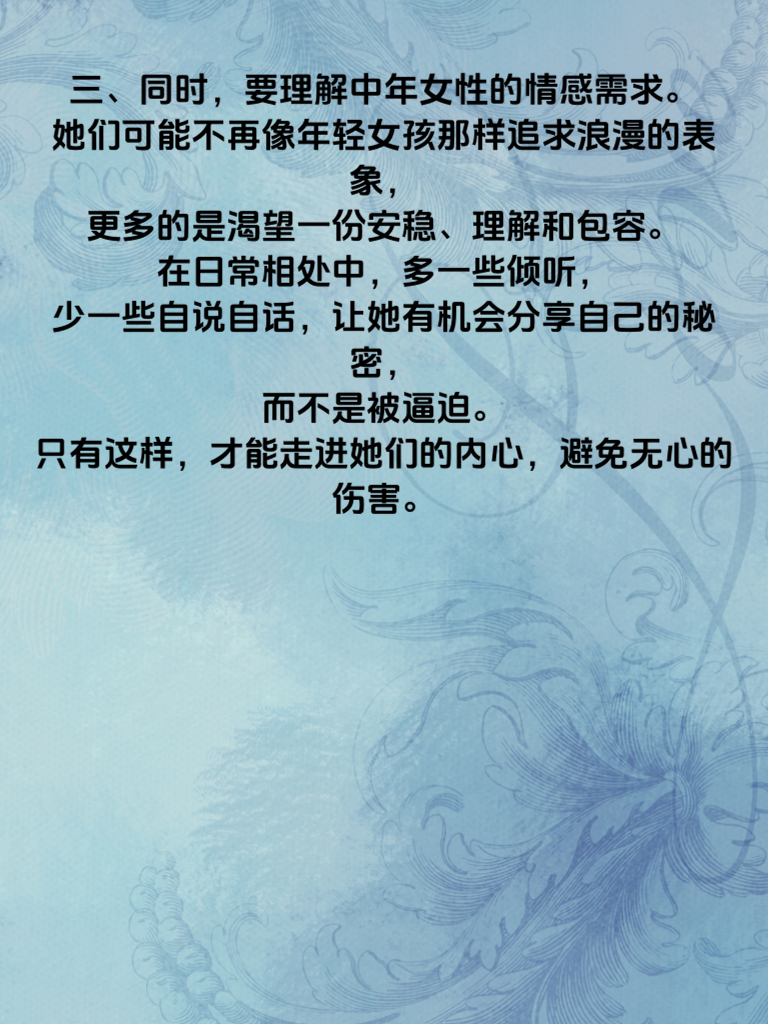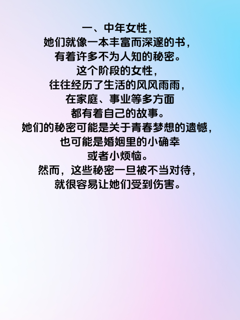 一、中年女性,她们就像一本丰富而深邃的书,有着许多不为人知的秘密。这个阶段的女性,往往经历了生活的风风雨雨,在家庭、事业等多方面都有着自己的故事。她们的秘密可能是关于青春梦想的遗憾,也可能是婚姻里的小确幸或者小烦恼。然而,这些秘密一旦被不当对待,就很容易让她们受到伤害。 二、在追求中年女性或者与她们相处时,男生要懂得尊重她们的秘密。不要试图强行窥探,而是给予足够的空间。比如,当她不想提及自己的过去感情经历时,就不要追问。因为这可能是她心中一块柔软而又脆弱的地方,你的尊重会让她感受到你的成熟与体贴。 三、同时,要理解中年女性的情感需求。她们可能不再像年轻女孩那样追求浪漫的表象,更多的是渴望一份安稳、理解和包容。在日常相处中,多一些倾听,少一些自说自话,让她有机会分享自己的秘密,而不是被逼迫。只有这样,才能走进她们的内心,避免无心的伤害。