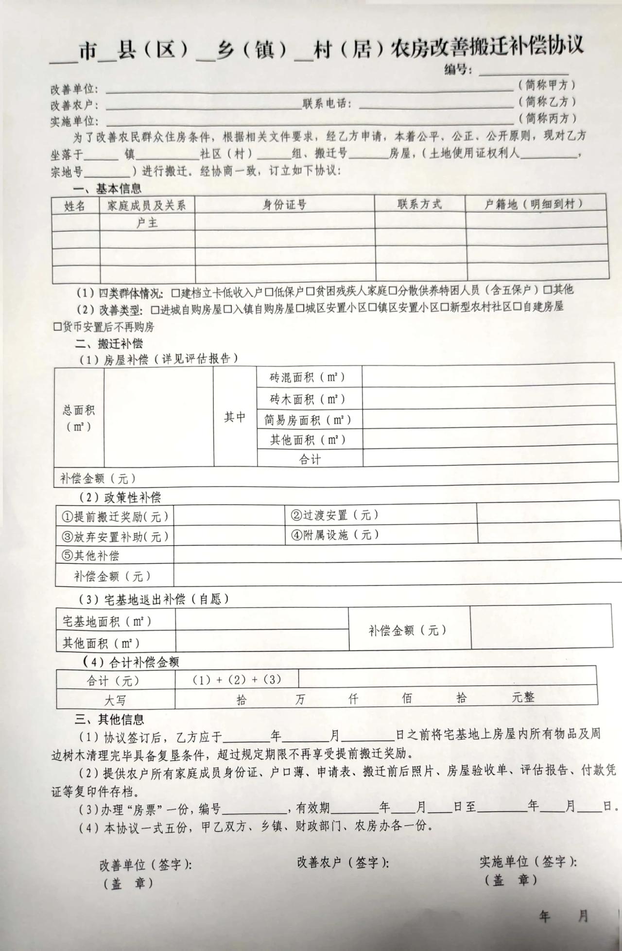 村长近日微信发给一农户的农房改善拆迁补偿协议。有懂的说说,这协议规范吗?个人感觉其中的猫腻和套路大概有3个。标准的搬迁协议是啥样的呀?
