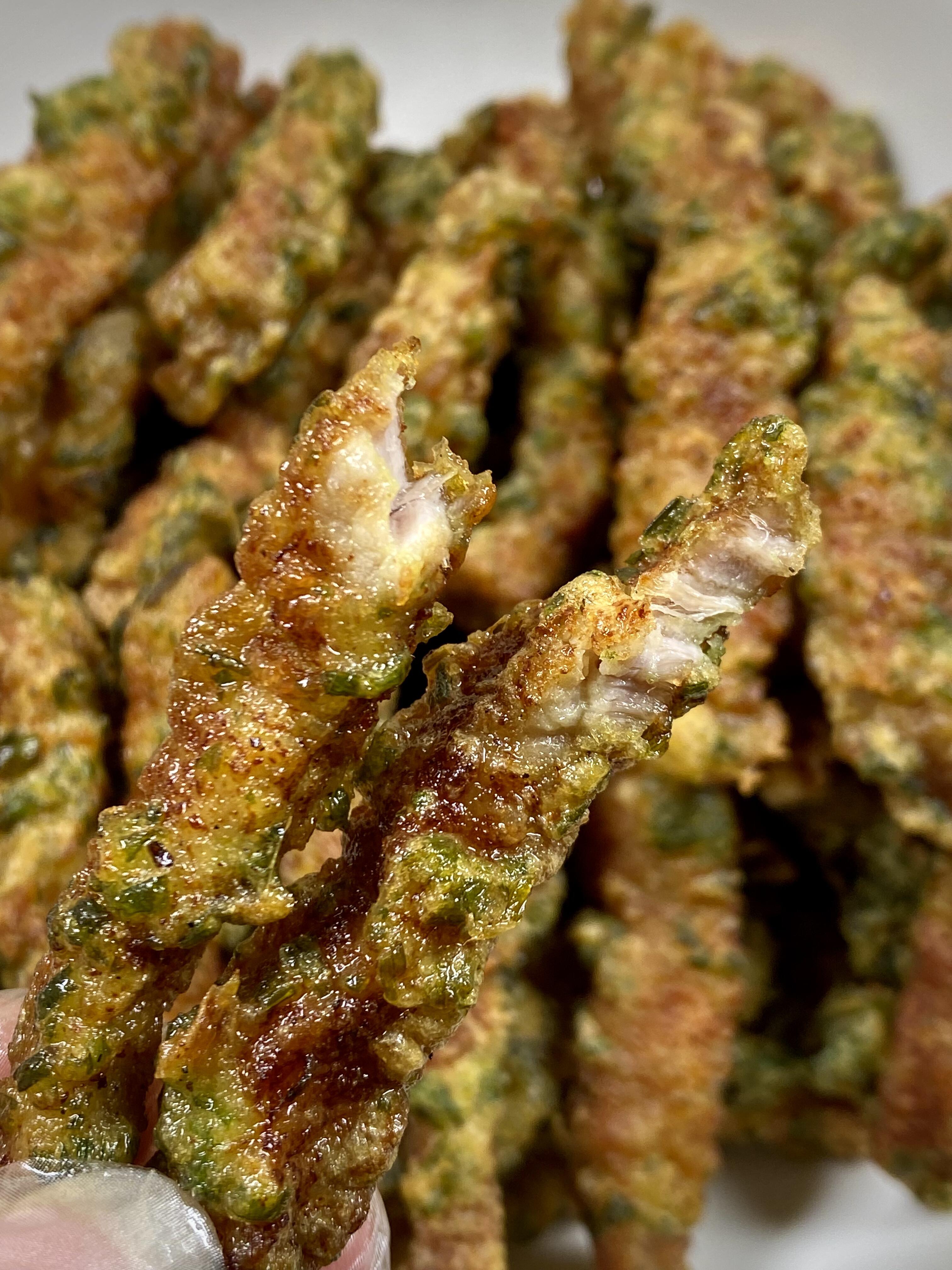 接着进行调味,在肉条里加入适量盐、少许黑胡椒粉,用手抓拌均匀,腌制15分钟,让肉质充分吸收调料与葱香。酥脆的关键,在于一碗恰到好处的酥肉糊。取一个干净的碗,打入一颗鸡蛋,加入一包小酥肉粉,再倒入少许清水,边倒边搅拌,搅至面糊呈浓稠的拉丝状,能均匀挂在肉条上不滴落即可。切记不要调得太稀,否则炸制时无法形成酥脆外壳,也不能过于干稠,会让口感发硬。将腌制好的肉条放入面糊中,再次抓拌,确保每一根肉条都被面糊均匀包裹。
