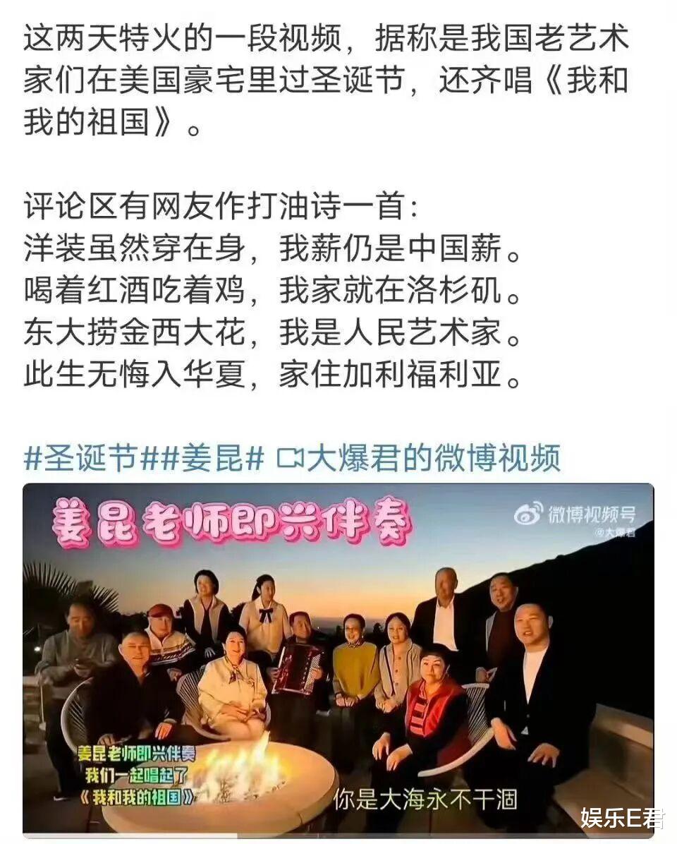 上周圣诞节,有个视频全网火爆。75岁的相声名家姜昆,在美国加州一栋大别墅里,领着一帮老艺术家过圣诞节。他们围坐在泳池边,深情款款地唱着《我和我的祖国》。身后是棕榈树、大草坪,还有反着光的私人泳池。