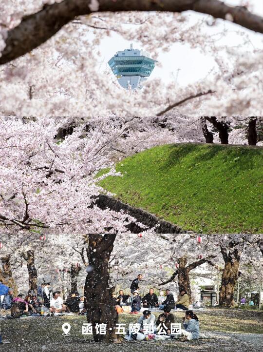 🌸(函馆市)五棱郭公园特色:星形城堡与2000余棵吉野樱相映成趣,夜樱灯光下如粉色星海,登塔俯瞰全景尤为震撼
