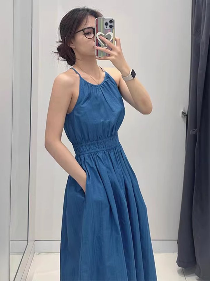 2025夏季新款独特漂亮蓝色挂脖吊带连衣裙子女法式高级感春装长裙