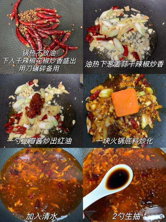 2⃣️油热下入葱段、姜片、蒜末、干辣椒炒出香味,加入一勺豆瓣酱炒出红油,一块火锅底料炒化,再倒入适量清水,加2勺生抽,适量盐和胡椒粉