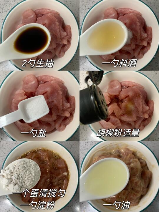 腌制肉片:2勺生抽➕一勺料酒➕适量盐和胡椒粉➕一个蛋清搅拌均匀,加入一勺淀粉搅匀,一勺油锁住水分腌制15分钟