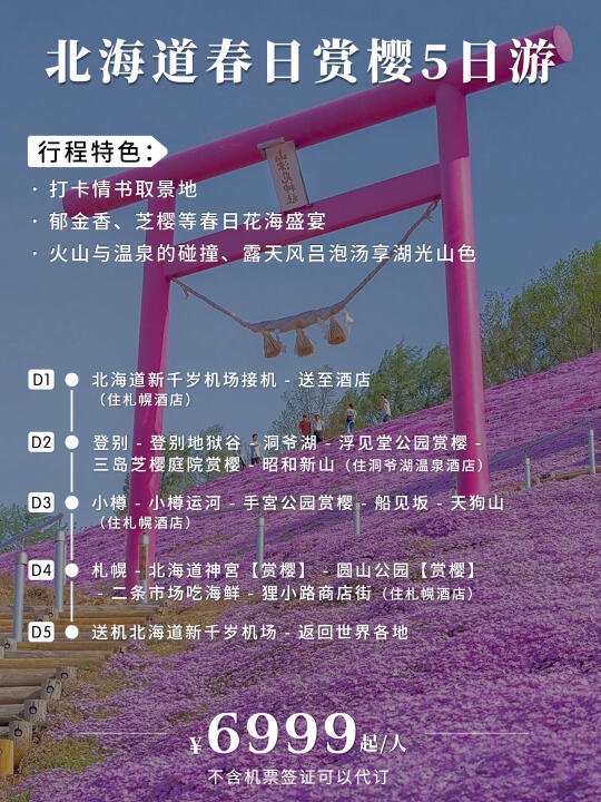 行程特色:打卡情书取景地、郁金香、芝樱等春日花海盛宴、火山与温泉的碰撞、露天风吕泡汤享湖光山色