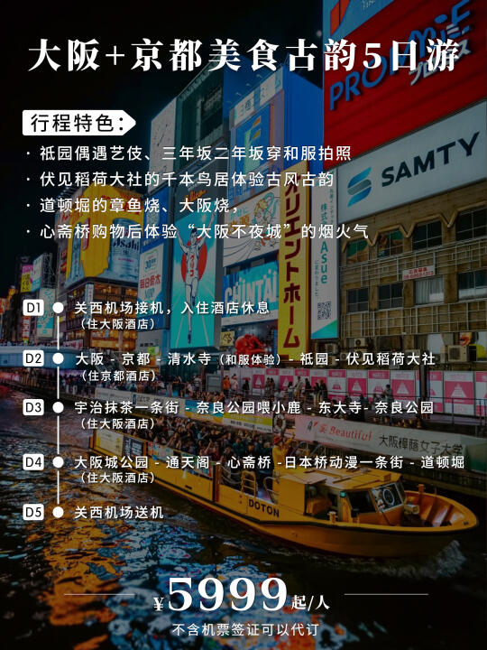 行程特色:祗园偶遇艺伎、三年坂二年坂穿和服拍照、伏见稻荷大社的千本鸟居体验古风古韵,道顿堀的章鱼烧、大阪烧,心斋桥购物后体验“大阪不夜城”的烟火气
