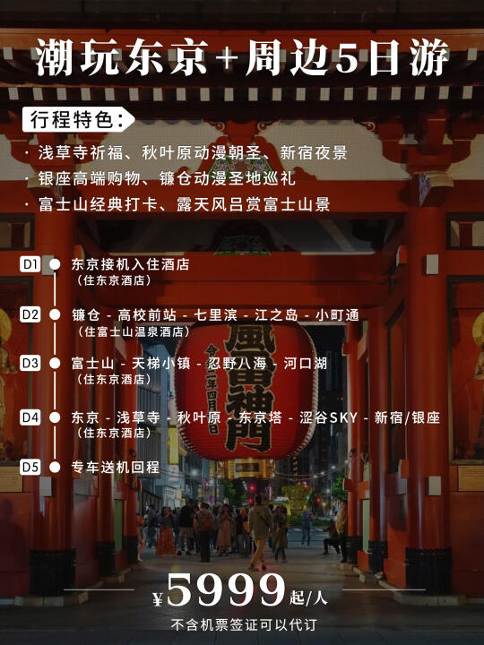 🫰🏻行程特色:浅草寺祈福、秋叶原动漫朝圣、新宿夜景、银座高端购物、镰仓动漫圣地巡礼、富士山经典打卡、露天风吕赏富士山景