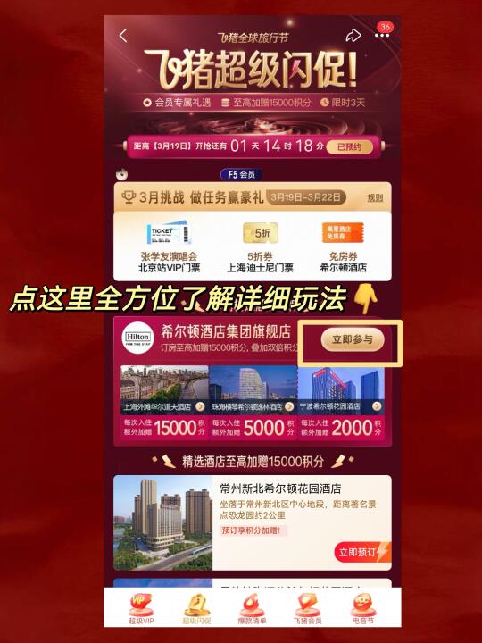 更重要的是飞猪经常有闪促,比如3月19日到21日就有一场,不仅每天可以抽50元和1000元无门槛代金券,闪促期间预定3月20号到下月25号的房间可以直接抵扣,另外还有全国多达几百家希尔顿旗下的酒店入住再送积分❗️最高返18000分。比如海南兴隆希尔顿逸林和长白山希尔顿逸林温泉酒店,平时房价也就五百多,本次闪促返5000分,再算上高卡会员免费的双早等权益四舍五入等于白住❗️参与方式已经放在图片里啦❗️