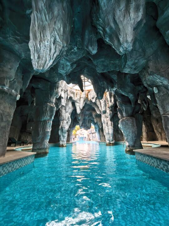 酒店在崖州湾,距离海边直线距离400米。公区还是可见当年希尔顿格芮独树一帜的设计,无论是大堂吧标志性的“CURIO”logo还是网红溶洞泳池都很出片,而且这家还单独在泳池区做了一个人工沙滩,很有泻湖的感觉