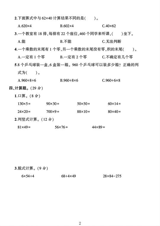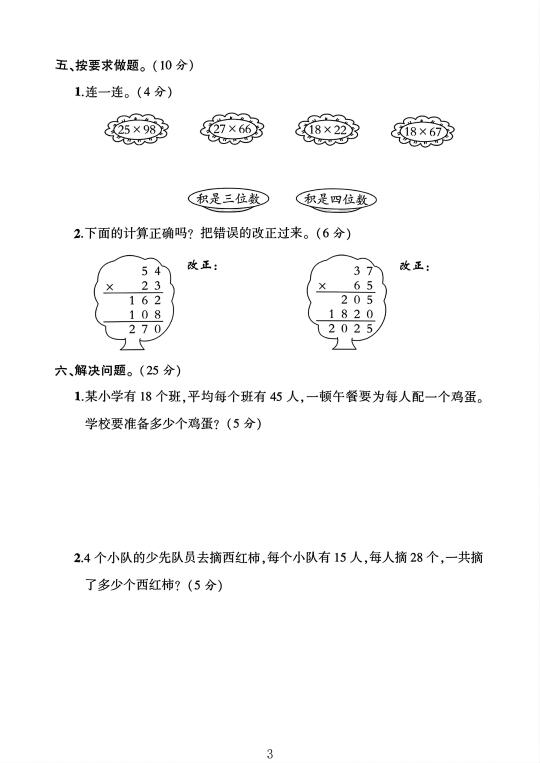 人教版 三年级下册数学 单元测试 试卷 第四单元测试卷 电子版可打印