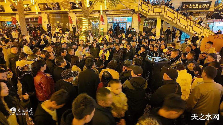 当夜幕降临,“黄金大道”更是美出了新高度,仿佛换上了一件华丽的晚礼服。精彩节目轮番上演,嗨翻全场。联名衔月阁时光音乐会温情开演,悠扬的旋律在夜空中飘荡,与金黄的夜景完美融合,让人仿佛置身于一个梦幻的世界。天水市西秦腔研究院的演员们亮相“黄金大道”,瞬间点燃了老秦人的情怀。他们将秦腔独有的苍凉与豪迈、细腻与深情演绎得淋漓尽致,每一个动作、每一句唱腔都充满了感染力,尽显千年秦腔的传统韵味与文化魅力。现场观众沉浸在这精彩的表演中,仿佛穿越时空,回到了那个古老的年代,沉浸式感受着非遗艺术的独特魅力。