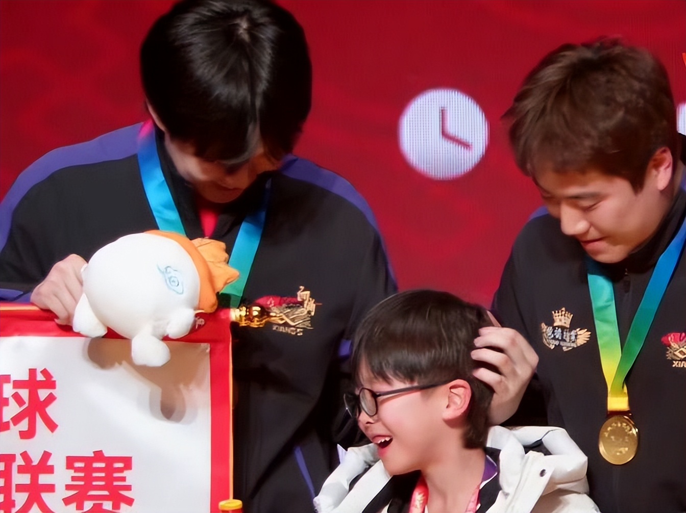 就在男团颁奖仪式上,山东魏桥主教练和运动员共同捧起奖杯,担任决赛球童的梁靖崑儿子也上台领奖,王楚钦摸头很喜欢他,大家一起庆祝这美妙的时刻,梁靖崑把自己的儿子抱起来,现场观众也为他们送上掌声,随后王楚钦一手拿着龙旗,一手帮忙抱着孩子,忙的可谓是不亦乐乎。