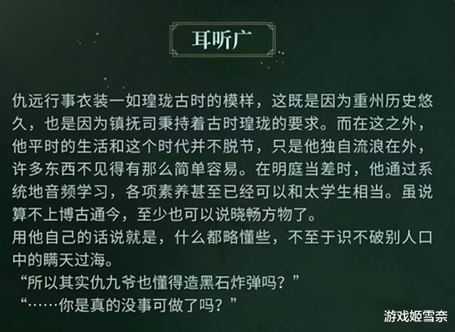 另外仇远这哥们有股幽默细胞在身上的,虽然穿着古装但为了避免自己在外奔波一身古装被当成老顽固大宰一笔,平常也经常上网音频学习,结果学着学着学成太学生水平,放下刀都能去科举了,然后有人吐槽他是不是听视频学会制作黑石炸弹了,仇远无语的表示你是不是吃饱了撑得,那种文静的人无语的吐槽令人忍俊不禁。