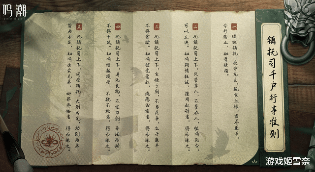 坏了,这下真是玩到大明王朝了,2.7版本接近尾声,漂子的江湖梦仇远终于快要上线了,这几天官方也发布了不少跟仇远相关的信息和介绍,仇远所属阵营瑝珑镇抚司的信息也透漏不少,看这章“镇抚司千户行事准则”,第一条就给我看一愣,“煌珑镇抚,受命龙主,既食上禄,当尽臣事,令行禁止,如臂使指。”我嘞个龙王驾到,说镇抚司这个部门直接受命于龙主,不受其他部门的限制,只管拿人不管办人。皇帝直属的特务机构,那不就是明朝的锦衣卫吗?这下玩的可真是明朝了,那镇抚司地位真是相当高了,不受诸官衙门限制只办大案,看来瑝珑还是非常在意残星会的,伤痕被克里斯托弗捞出来就直接当大案跨国追杀了。