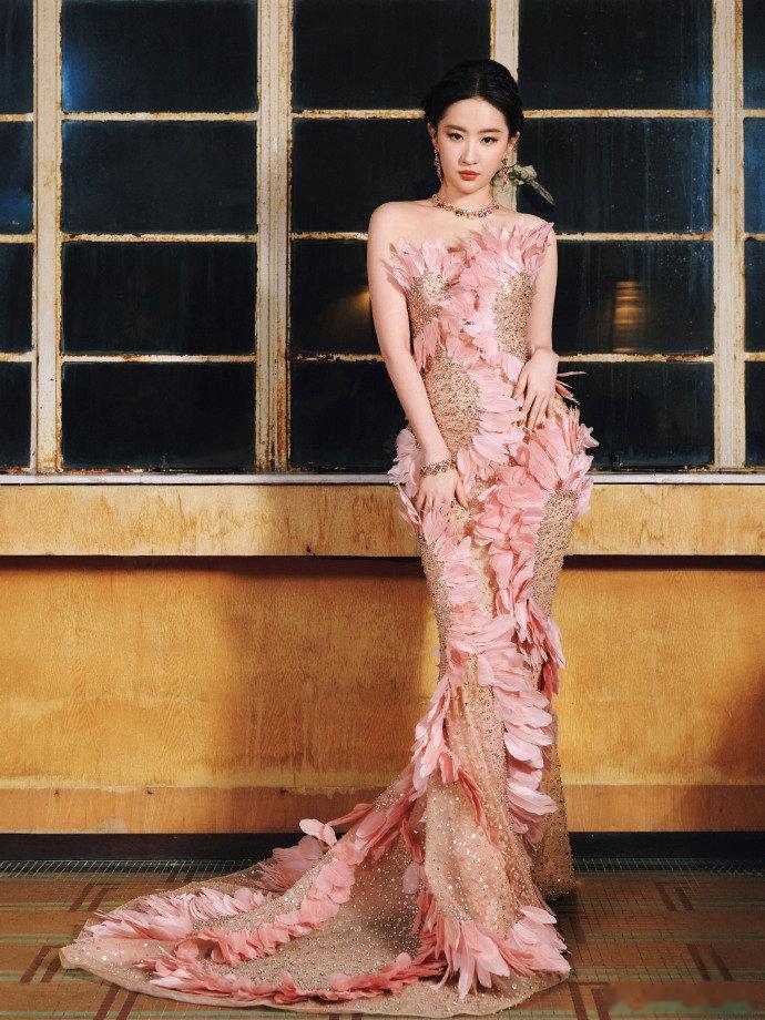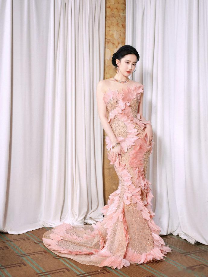 刘亦菲羽毛拖尾裙造型刘亦菲粉色羽毛裙杀疯了!这哪是走红毯,分明是迪士尼在逃公主下