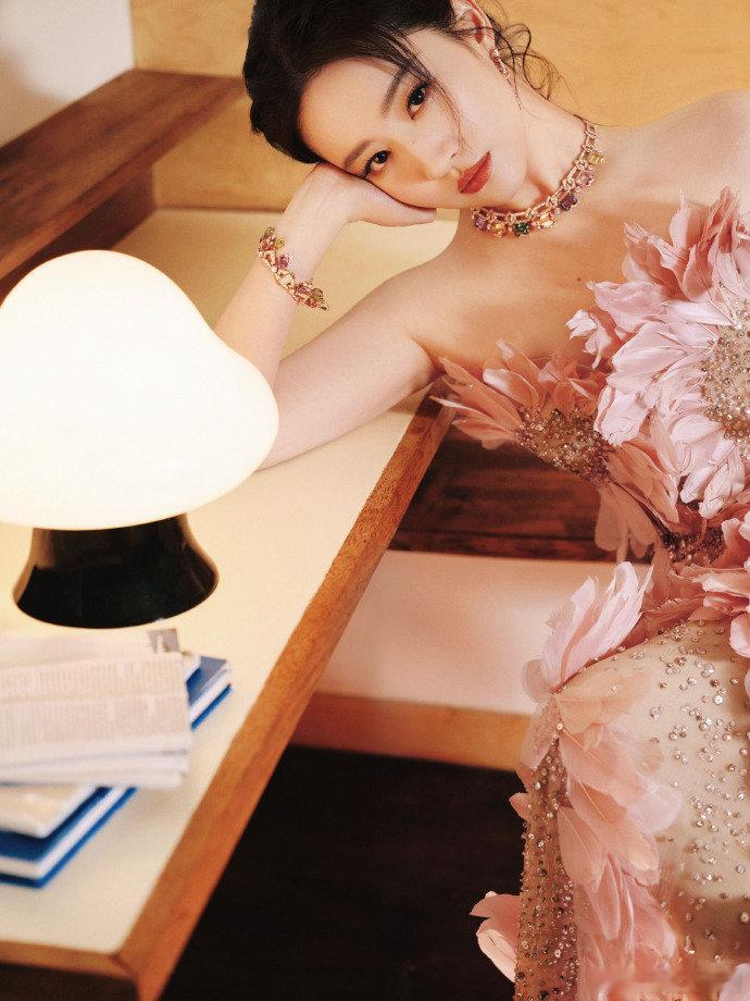 刘亦菲羽毛拖尾裙造型刘亦菲粉色羽毛裙杀疯了!这哪是走红毯,分明是迪士尼在逃公主下凡啊刘亦菲粉色羽毛抹胸裙造型电视剧品质盛典红毯