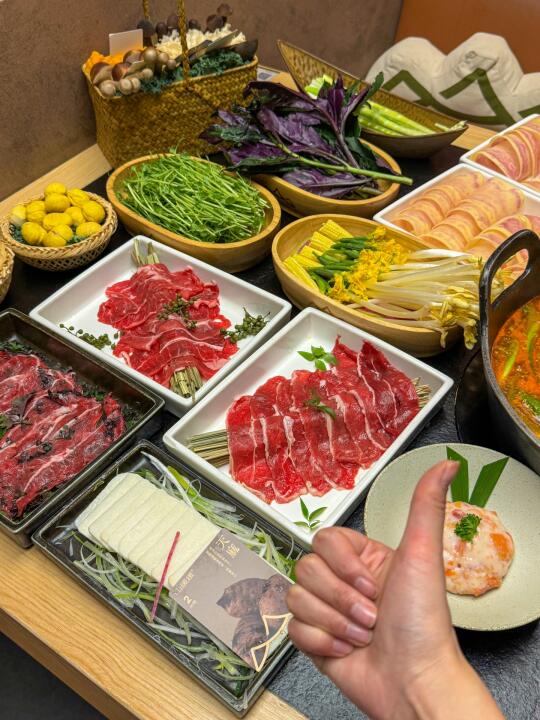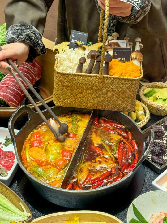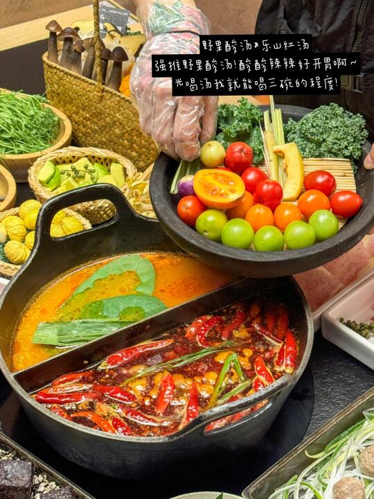 锅底我就推荐这一个!光是汤底我都能连喝三碗!一大盆新鲜蔬果上桌现煮,酸汤味道很浓郁,涮什么都好吃!爱吃辣的乐山红汤也少不了!