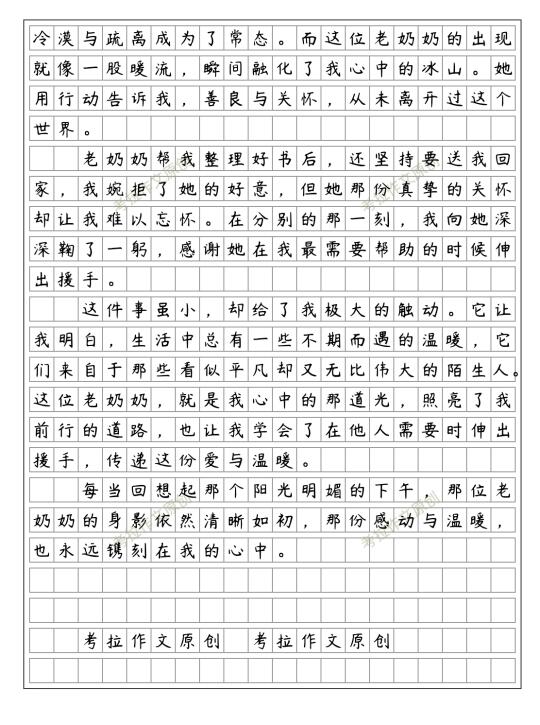 七年级下册第一单元作文,令我感动的陌生人-陌生的老奶奶。那位老奶奶的身影依然清晰如初,那份感动与温暖,也永远镌刻在我的心中。