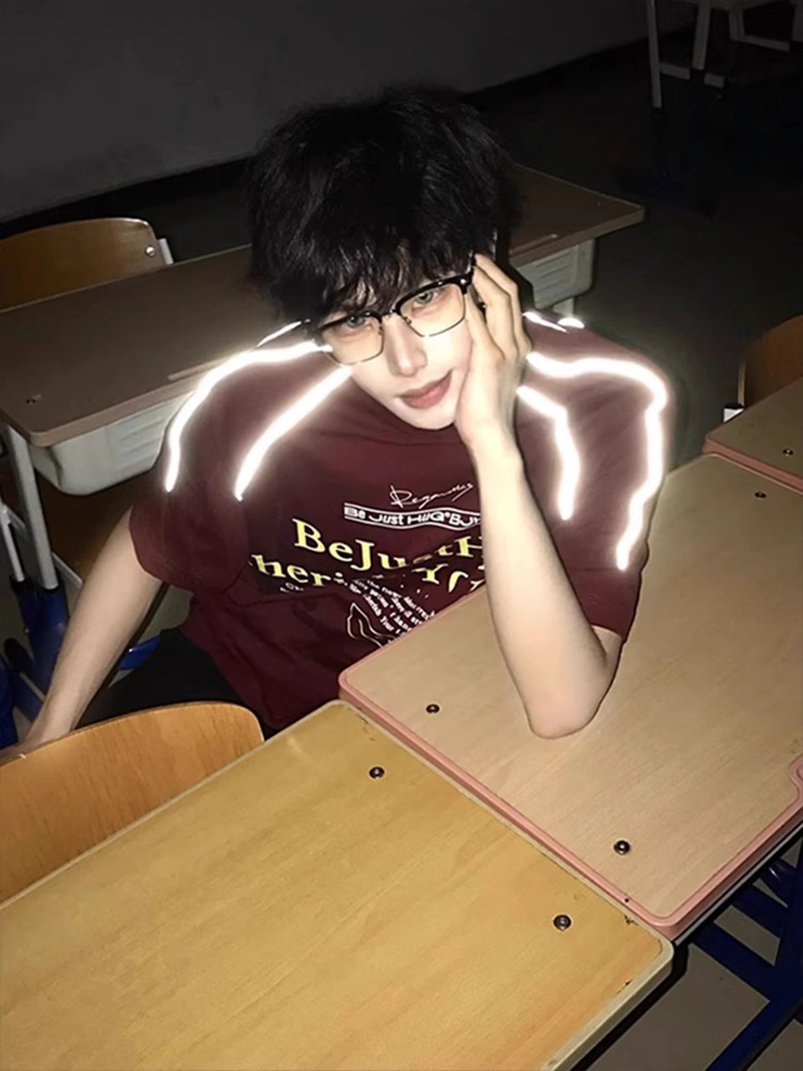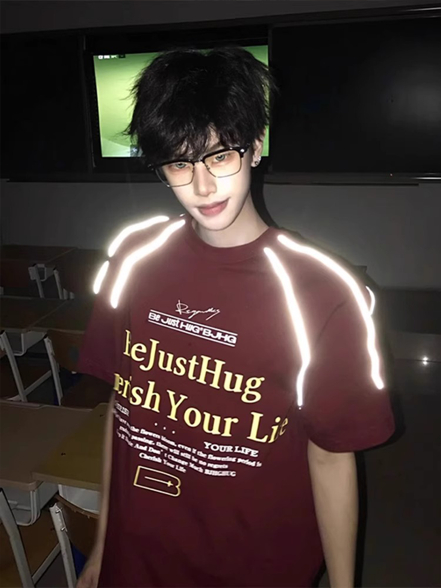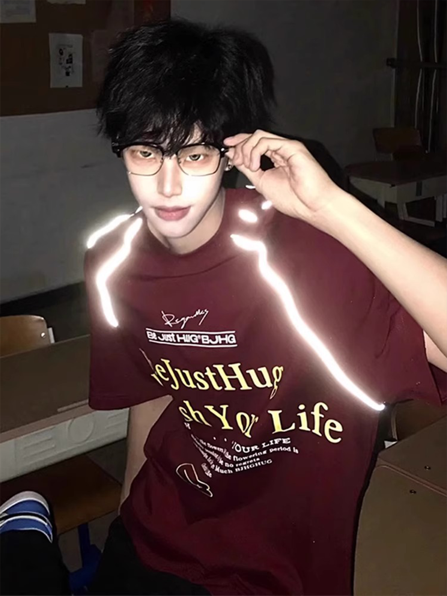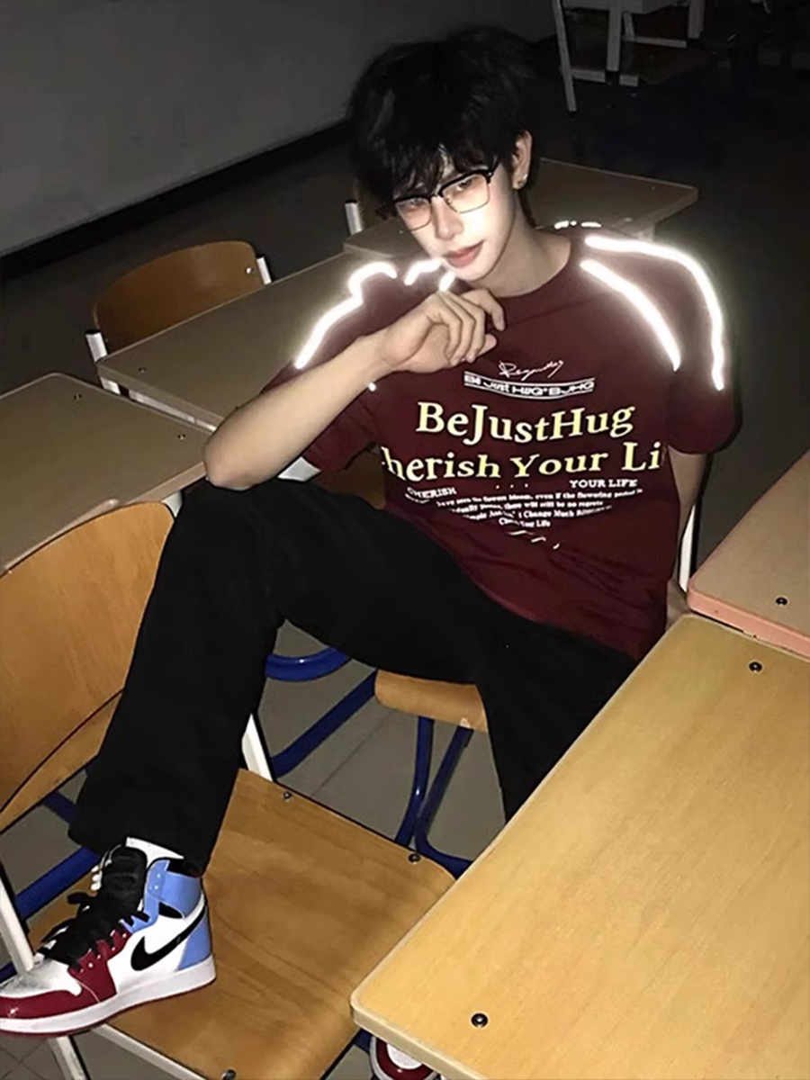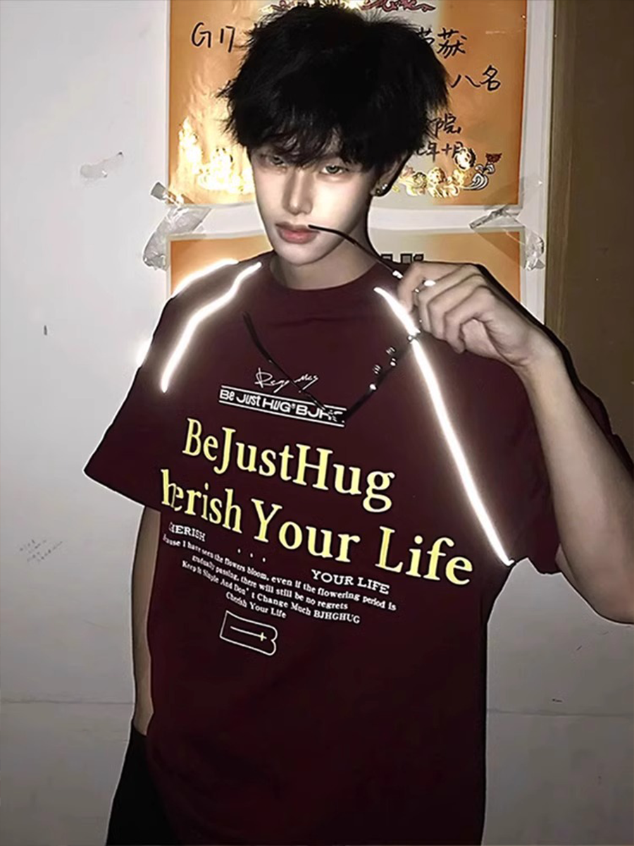 字母印花酒红色圆领短袖男夏季美式复古少年