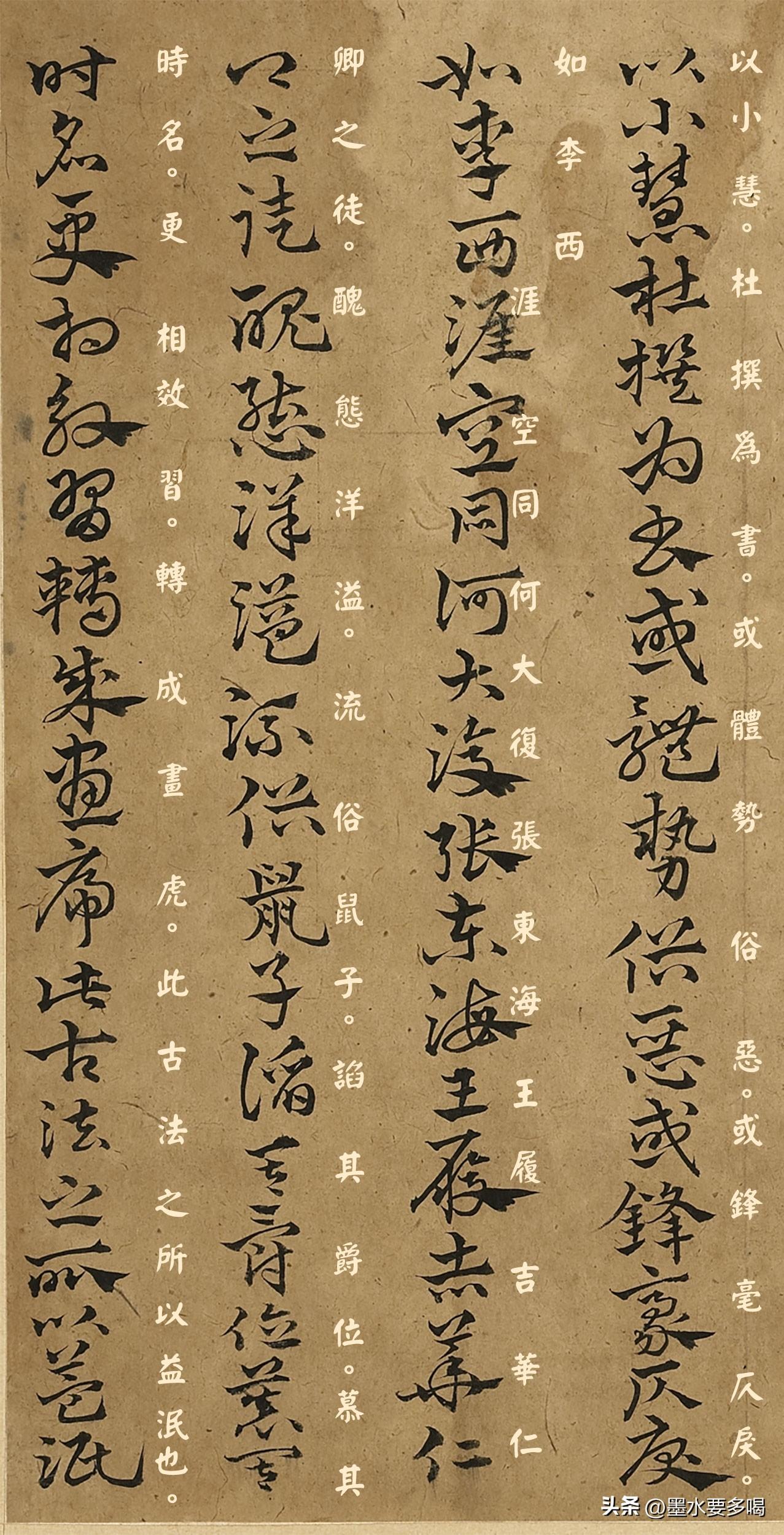 古代书家骂人,也是挺难听的! 明代名人、书法家丰坊所创作的学书心得名篇《书诀》里头除了详细分享了自己的学书要诀,也顺带骂了一些他认为不入流或恶俗的同时代书家,如李东阳(西涯)、李梦阳(空同)、张弼(东海)、王宠(履吉)、华云(仁卿)等等诸人,还相当难听(当然,这只是丰氏一家之言)! 我们可以看看这段原文,他说:今人不闻古诀。不见古帖。妄以小慧。杜撰为书。或体势俗恶。或锋毫仄戾。如李西涯空同何大复张东海王履吉华仁卿之徒。丑态洋溢。流俗鼠子。谄其爵位。慕其时名。更相效习。转成画虎。 这段话说的其实挺难听的,翻译过来是:这些人,他们的书法丑态百出。世俗庸人因为谄媚他们的官位,仰慕他们的时名,争相效仿学习,结果反而成了"画虎不成反类犬"。 这段话丰坊用亲笔书写过,这附件次分享的书法作品,就是这段内容,章草书写。 如果你感兴趣那就也看一看吧:)