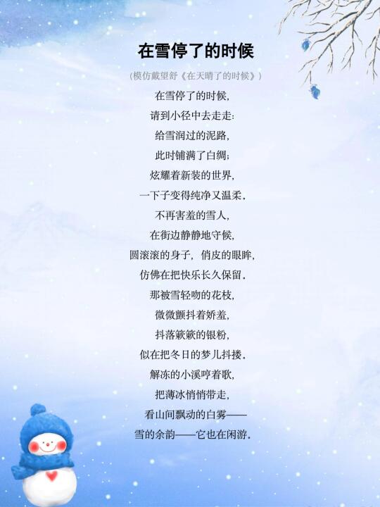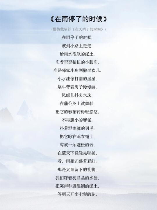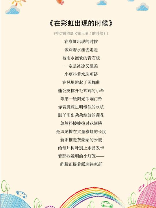 四年级下册戴望舒《在天晴了的时候》仿写,《在花开了的时候》,《在雪停了的时候》,《在彩虹出现的时候》,《在雨停了的时候》。