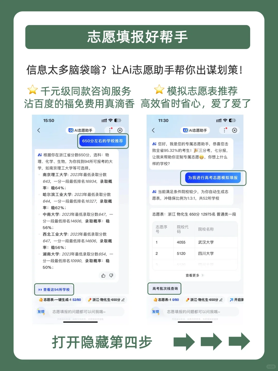 明确位次后,看这些院校过往招生的最低分数线,上下浮动20分,基本可以圈定今年你报的院校范围。接着用百度Ai志愿助手,输入分数和个人信息,获得免费的冲、稳、保择校建议。还可以和下面的Ai聊志愿咨询更多报考信息,如院校排名、专业、校园环境等详情。