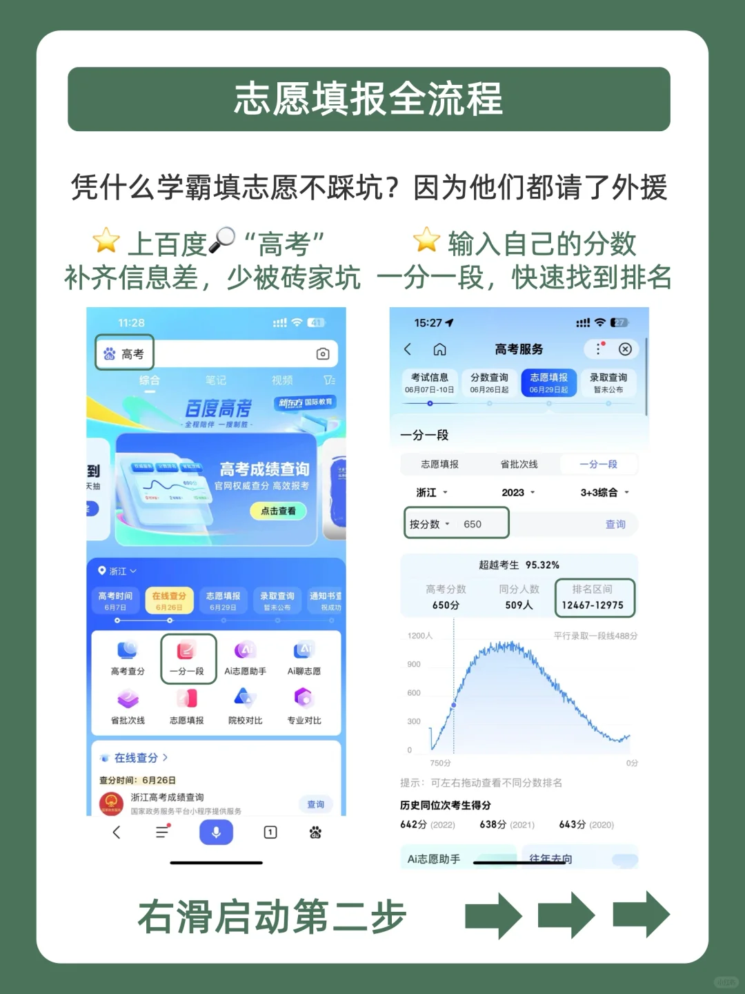 除了分数,更重要的是你的位次!知道自己全省排名+同分数人数,准确定位自己。直接百度搜🔍高考,点下面一分一段,输入分数,就可以找到自己分数在今年甚至过往3年的本省的排名