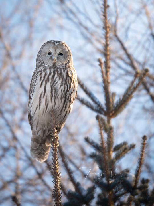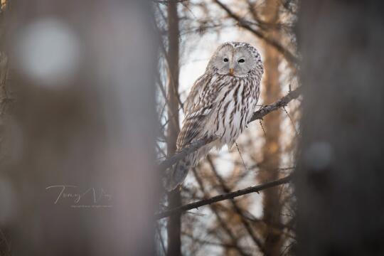 它们就像是生活在欧亚北方森林中的精灵,身体的颜色与覆雪的森林浑然一体,眯缝着的眼睛中包藏着森林的深邃。它们是茫茫林海的主人,它们有着比例夸张的一双巨爪(远比乌林鸮的大),白天沉浸于森林编织的梦境中,晚上则化身令小动物胆寒的猎手。