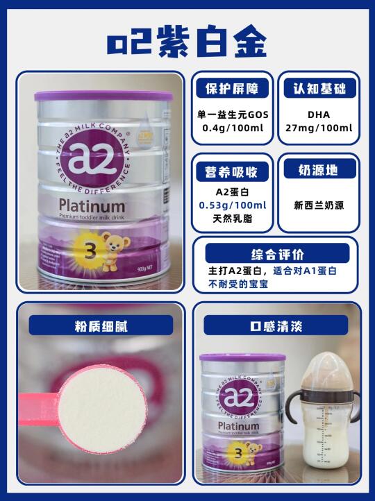 总的来说每款奶粉各有优势,A2紫白金适合A1蛋白不耐受宝宝,皇美适合作为短效提升口粮,而爱他美白金澳洲版适合想要长效稳固自护力,并且能兼顾认知力发展的宝宝。