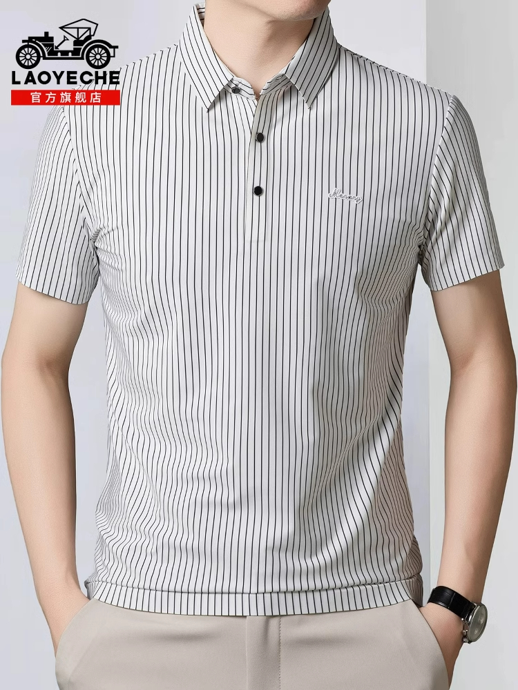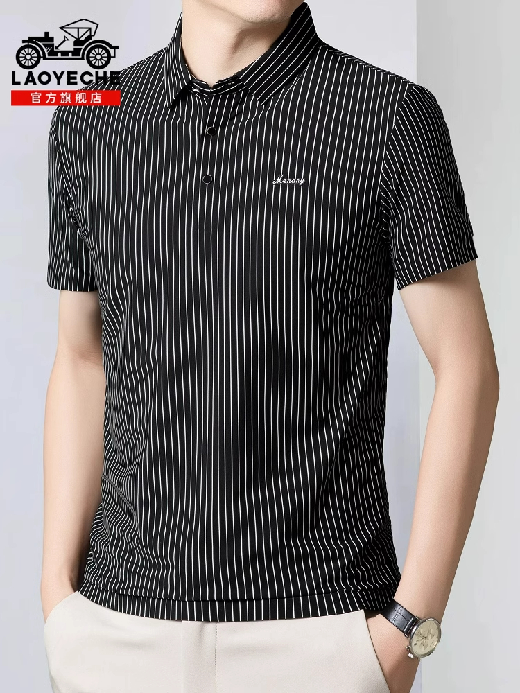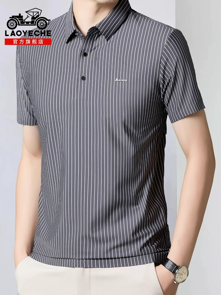 桑蚕丝轻盈夏装!条纹大码商务休闲T恤,弹力时尚,百搭爸爸短袖,夏季透气享受。