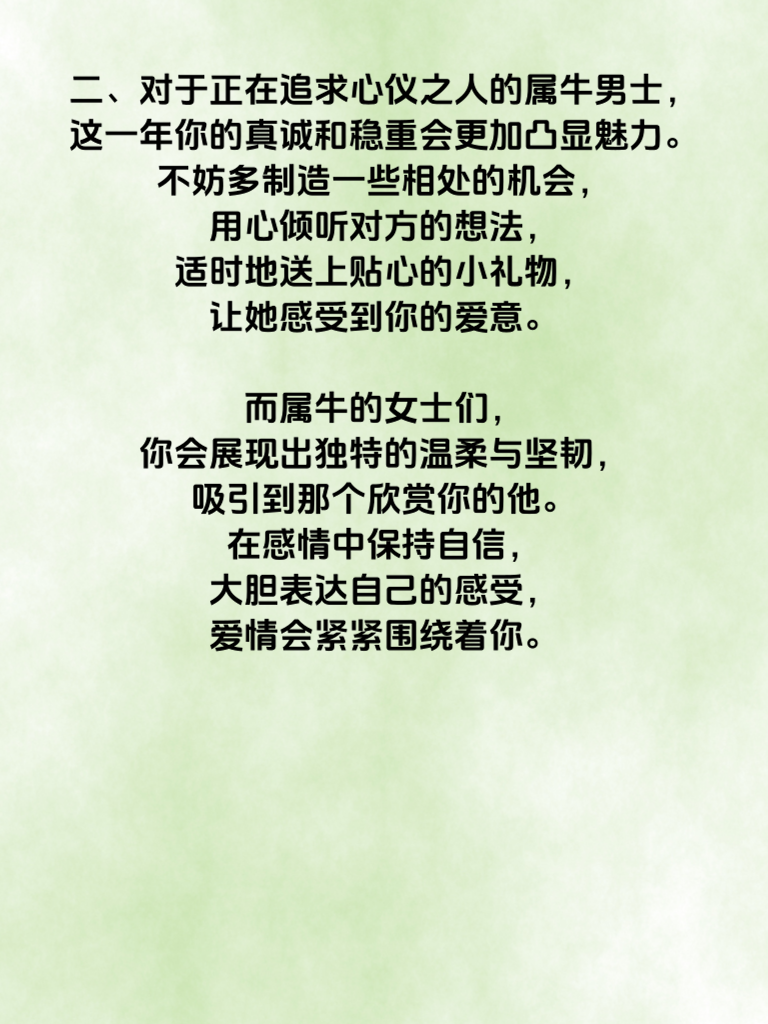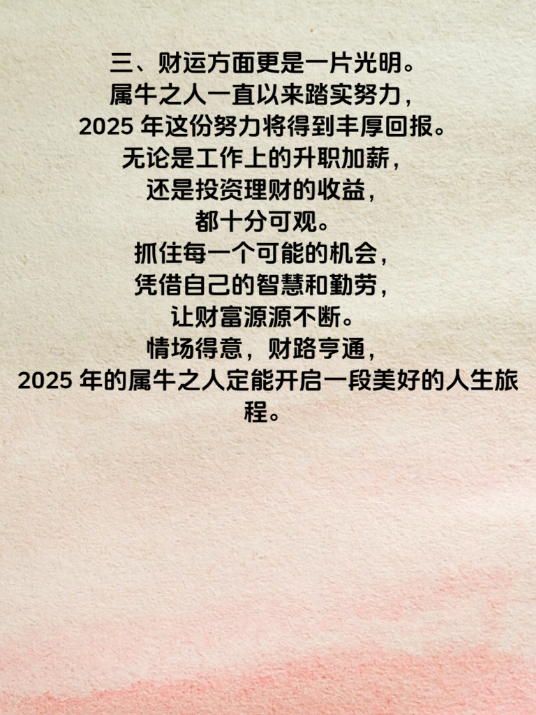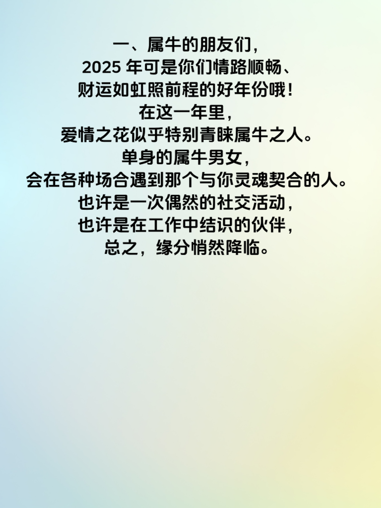 一、属牛的朋友们,2025 年可是你们情路顺畅、财运如虹照前程的好年份哦!在这一年里,爱情之花似乎特别青睐属牛之人。单身的属牛男女,会在各种场合遇到那个与你灵魂契合的人。也许是一次偶然的社交活动,也许是在工作中结识的伙伴,总之,缘分悄然降临。 二、对于正在追求心仪之人的属牛男士,这一年你的真诚和稳重会更加凸显魅力。不妨多制造一些相处的机会,用心倾听对方的想法,适时地送上贴心的小礼物,让她感受到你的爱意。而属牛的女士们,你会展现出独特的温柔与坚韧,吸引到那个欣赏你的他。在感情中保持自信,大胆表达自己的感受,爱情会紧紧围绕着你。 三、财运方面更是一片光明。属牛之人一直以来踏实努力,2025 年这份努力将得到丰厚回报。无论是工作上的升职加薪,还是投资理财的收益,都十分可观。抓住每一个可能的机会,凭借自己的智慧和勤劳,让财富源源不断。情场得意,财路亨通,2025 年的属牛之人定能开启一段美好的人生旅程。