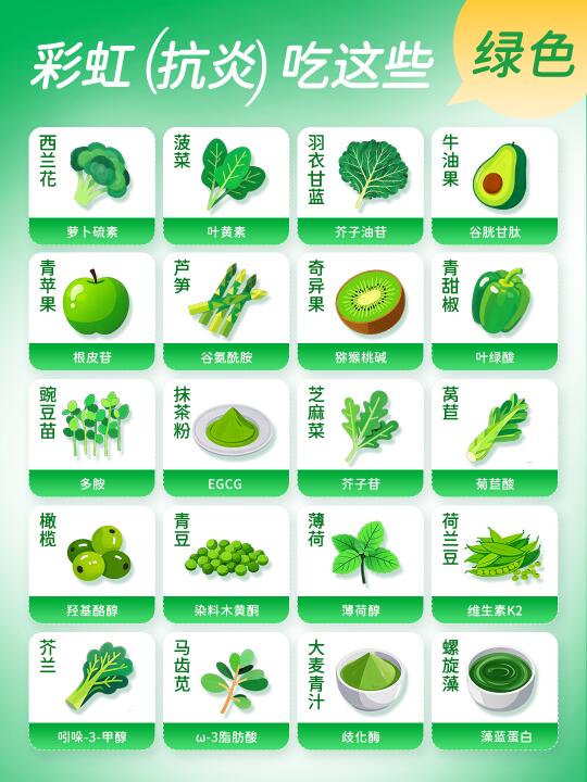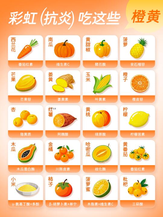 红、橙、黄、绿、紫、黑、白——大自然用色彩为食材标注了“天然说明书”。不同颜色的蔬果谷物中,藏着属于自己的抗炎成分: