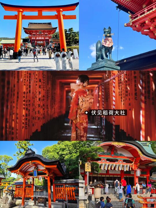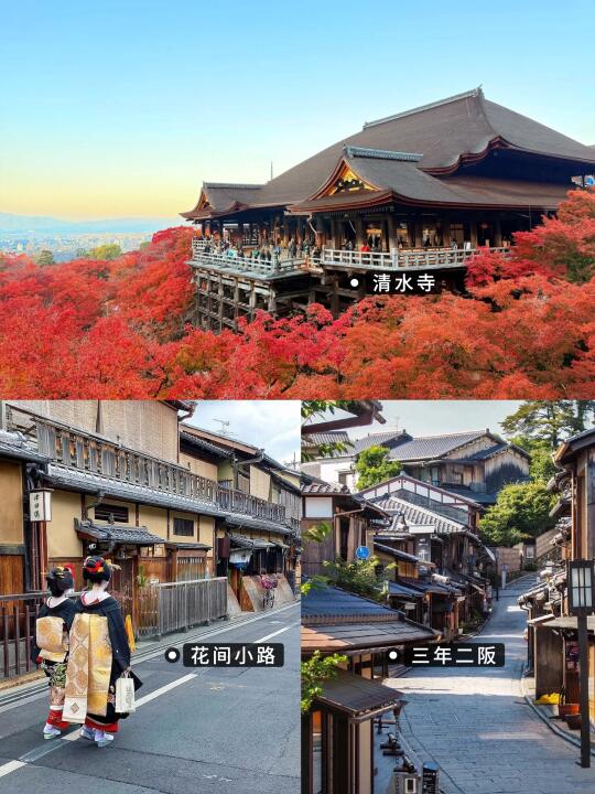 清水寺(世界文化遗产,古色古香的建筑,还能打卡📸柯南同款照片)→花间小路(日式风格的街道、偶尔还能偶遇艺伎)→三年二阪→伏见稻荷大社(朱红色的鸟居、寺庙和蓝天特别搭)