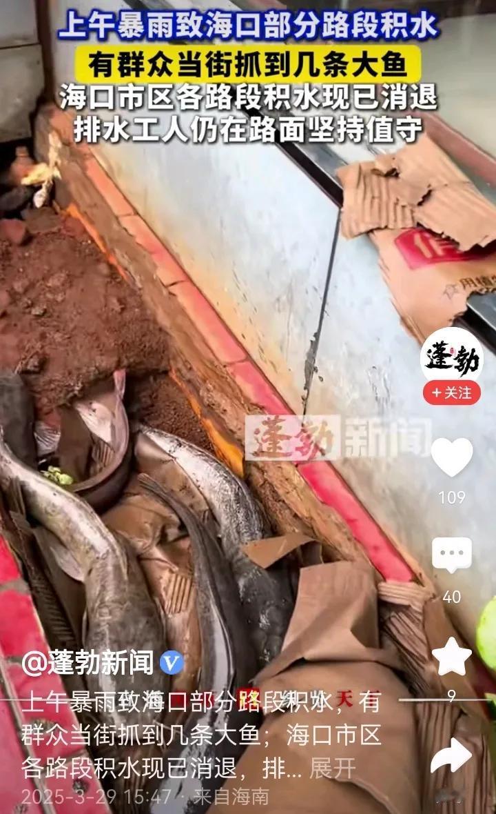 坐标海口,没觉得今天的雨有多大呀,有人在马路上都能逮到鱼,也不知道什么鱼,好不好