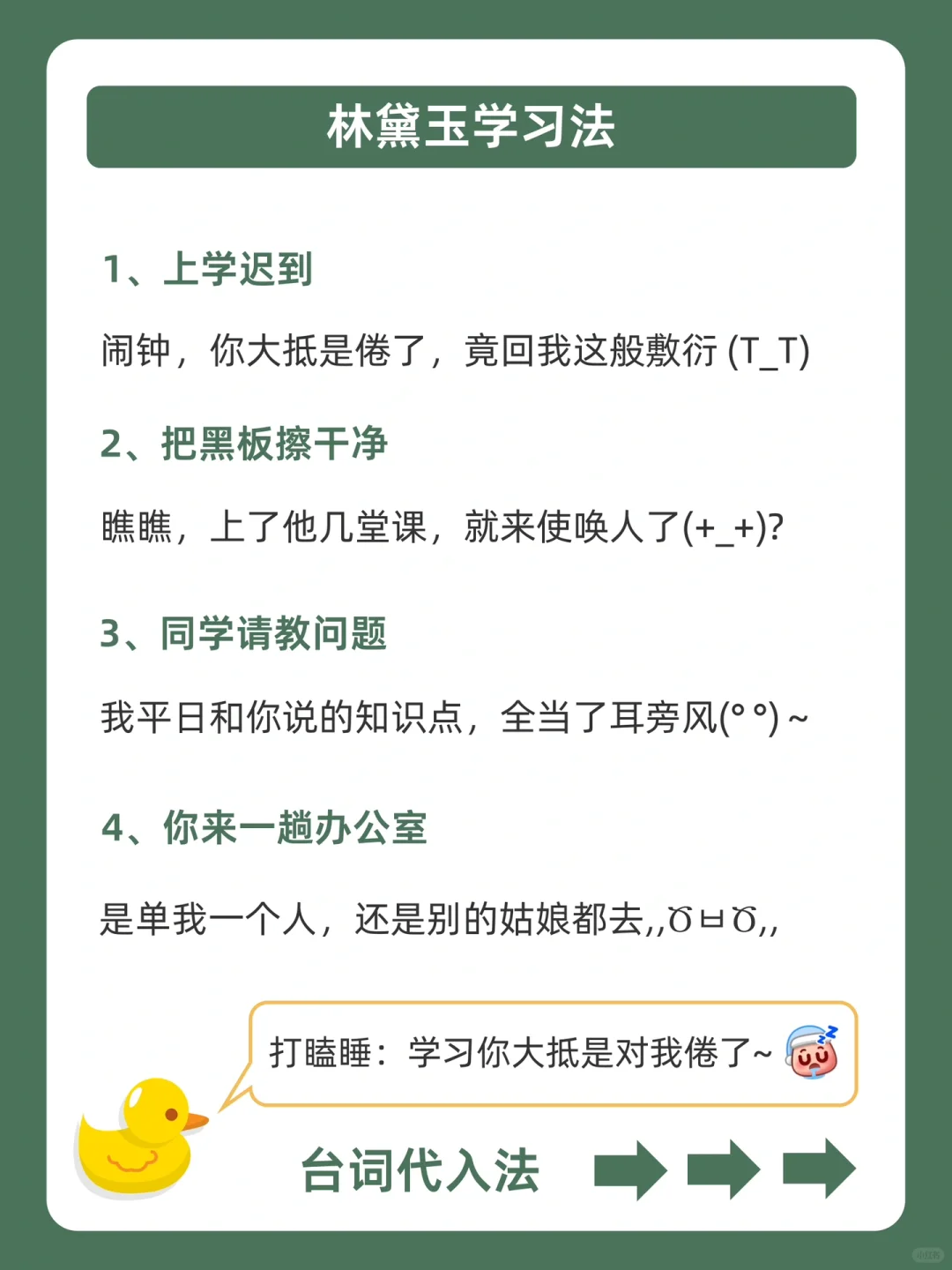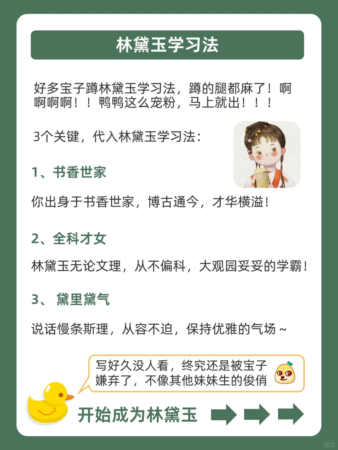 . [赞R]学习摆烂不用怕,鸭鸭带你做学霸❗ . [向右R]好多宝子蹲林黛玉学习法,蹲得腿都麻了![石化R] . [点赞R]鸭鸭这么宠粉,投稿和建议都会认真对待的哇![哇R] . 今天就来分享,林黛玉学习法,都在上面的图,看完就会用!从此偷偷学习,逆袭学霸![赞R] . 🐣我是鸭鸭,持续更新优质学习笔记,陪宝子们疯狂内卷,校园逆袭![赞R]