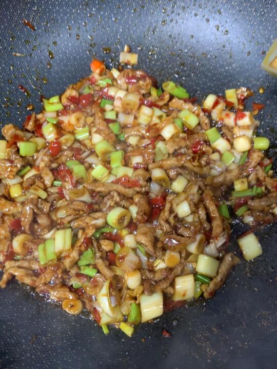 [星R][星R]正宗重庆版鱼香肉丝!个人感觉比木耳胡萝卜版更好吃[色色R]肉丝炒得很入味且嫩滑~裹满料汁,简直是下饭神器啊啊啊! 食材:猪肉、大葱、泡椒、泡姜、蒜 鱼香汁:半小勺鸡精➕4小勺白糖➕一勺生抽➕3勺醋➕一勺料酒➕半勺老抽➕半勺淀粉➕一勺清水搅匀 做法: 1⃣️热锅凉油倒入肉丝快速划散炒至变色,加入泡椒泡姜末、蒜末、一勺豆瓣酱炒出红油 2⃣️加入葱段翻炒均匀,倒入鱼香汁翻炒几下即可出锅