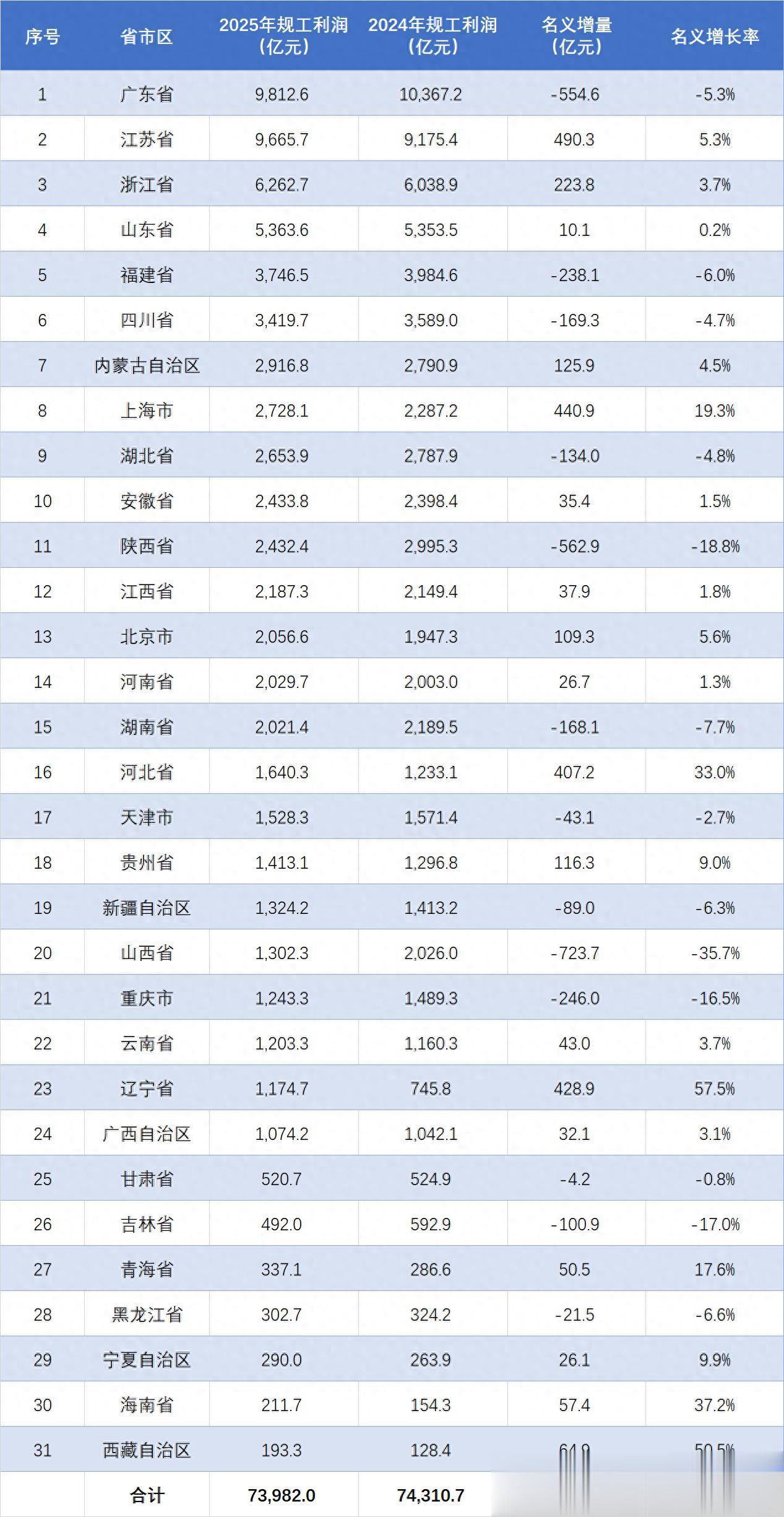 工业是我国国民经济的重要组成部分,工业的发展水平在一定程度上也反映了地方经济发达程度。据最新统计数据显示,2025年度,全国31个省市区规模以上工业企业共实现利润总额7.40万亿元,较上年同期减少328.7亿元,小幅下滑0.4%。