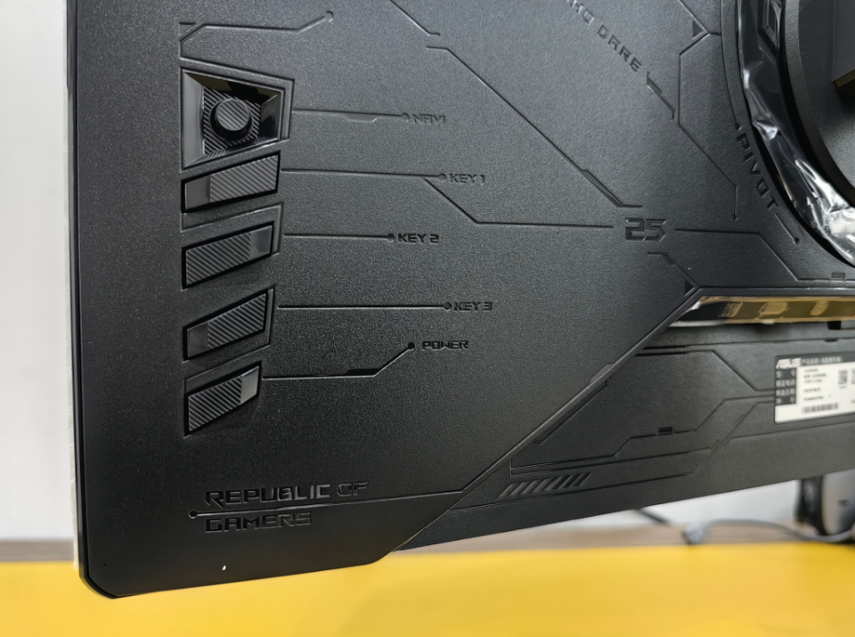 🔺ROG绝杀25电竞显示器的操控区在它背面的右手边,采用了一颗5维摇杆(5向OSD导航操纵杆)以及4颗大按钮的功能按键,按键手感不错。这么设计的好处显而易见,可以很容易实现盲操作。