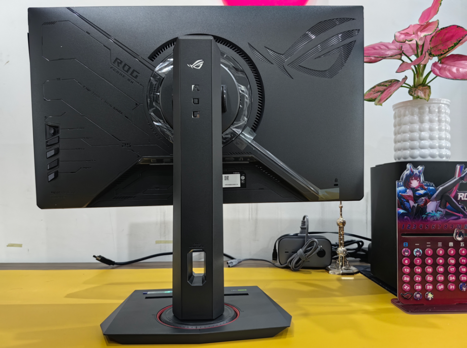 🔺组装好的显示器还是挺帅气的,可以看到屏幕的面板有防眩光涂层,并且ROG“一刀流”外观,不占地方的方形底座,理线孔等经典设计系数登场。