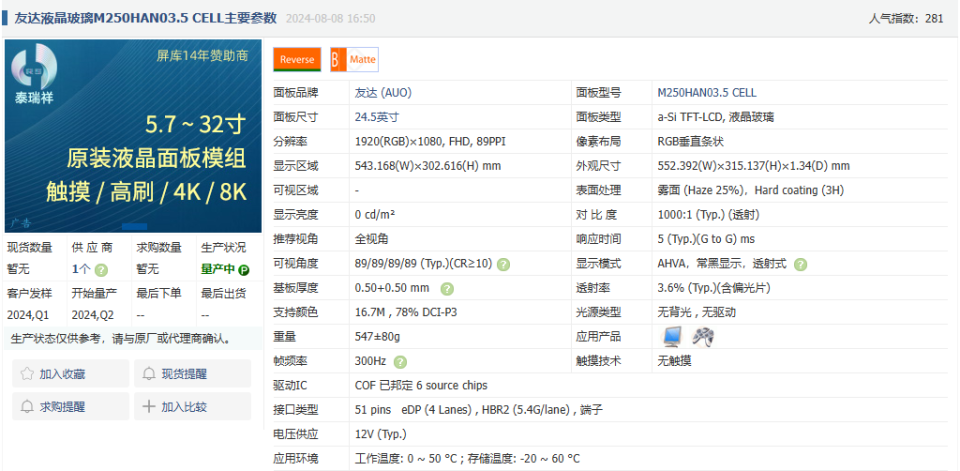 🔺屏库官网也收录了这款显示器的基本信息,目前这里显示的信息还不是挺全,比如说还看不到显示亮度。需要说明的是,屏库这里提供的信息只是代表显示面板的基本信息参考,并不代表成品显示器的最终显示效果,因为最终显示效果与生产厂家的调校和优化有着很大的关系。