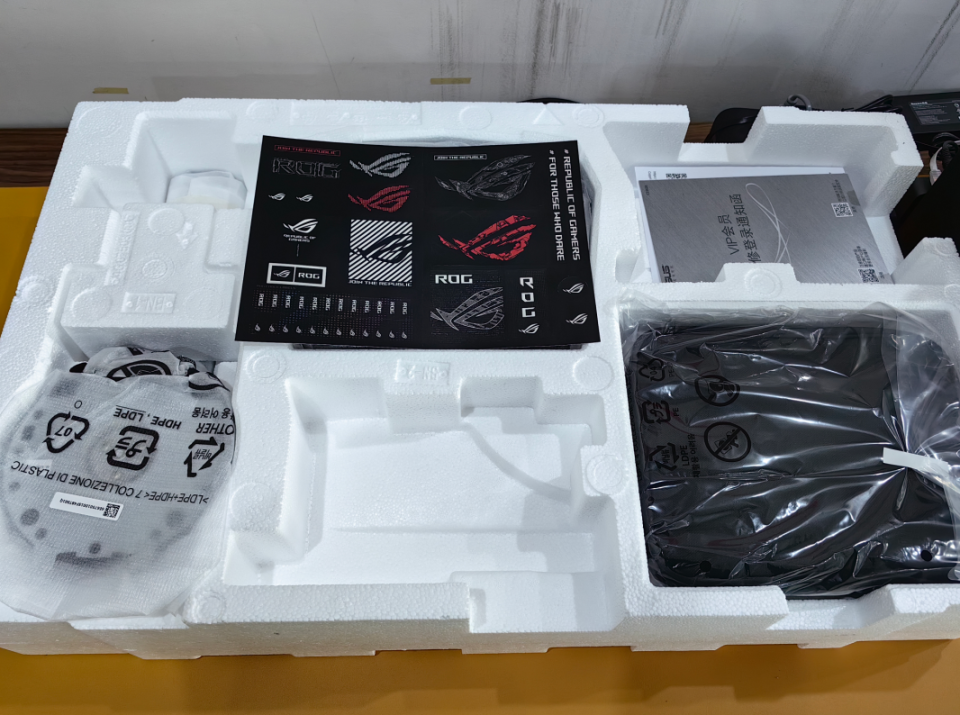🔺配件部分包括说明书、保修卡,一张ROG信仰贴纸,还额外的使用了一个配件收纳包(果然有信仰就是做的到位~)。