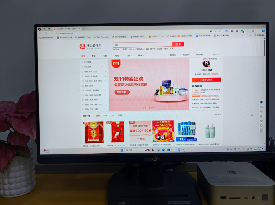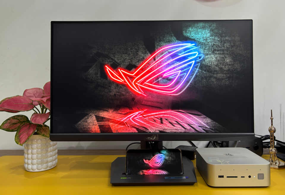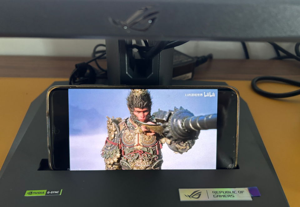🔺既然前面提到它的多功能底座,这里也给大家展示下。首先需要说明的是这个底座确实不占地方,大家可以通过我放入的华为P60手机对比下就能看出,然后就是这个放手机的插槽,平时手机放在这里,可以用显示器TYPE-C口同时给手机充电,除了可以不错过信息,还能和我一样边玩游戏边看攻略也是不错的。
