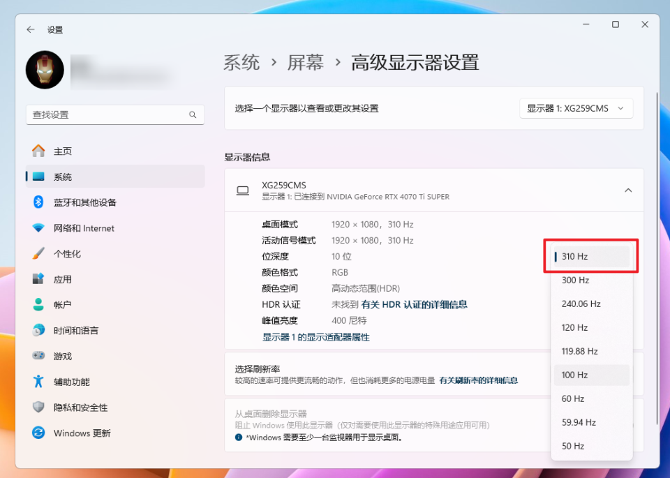 🔺ROG绝杀25显示器在连接Windows电脑之后,我们可以直接在显示器设置里面开启310Hz的刷新率了,不过这里有两个前提条件:一个是显卡支持310Hz的输出能力(前面提到我使用的显卡是4070Ti Super,这个是没问题的)。