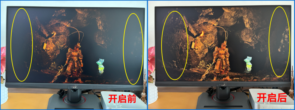 🔺就比如说我在玩《黑神话:悟空》中的这段山洞界面,开启和关闭动态阴影增强功能两者的区别还是很大的,开启之后很明显看到洞内的细节更多了。